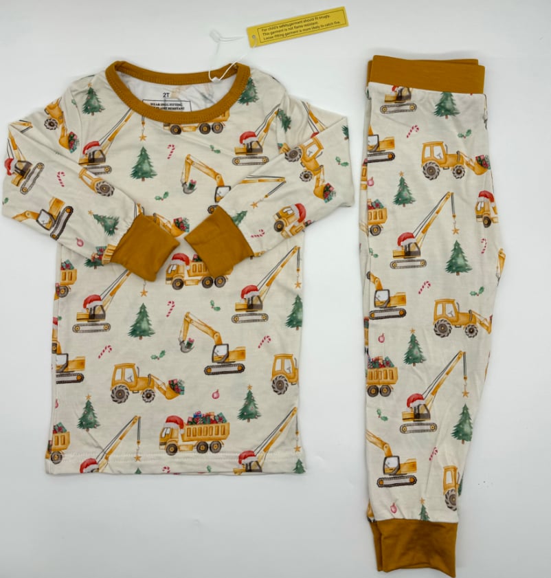 Build up the holiday fun with our Construction Equipment Holiday Bamboo Pajamas! Featuring a festive mix of diggers, dump trucks, and cranes decked out for Christmas, these are perfect for your little builder’s winter adventures and cozy nights in.