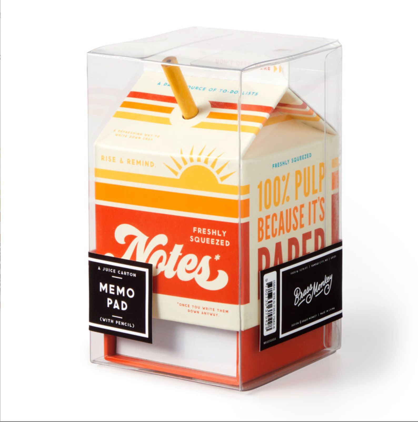 Sure it looks like an orange juice carton, but lift off the top, and you'll find a block of 500+ tear-off sheets of paper - making this note set by Brass Monkey perfect for reminders, doodles, or that to-do list that's bordering on expired.