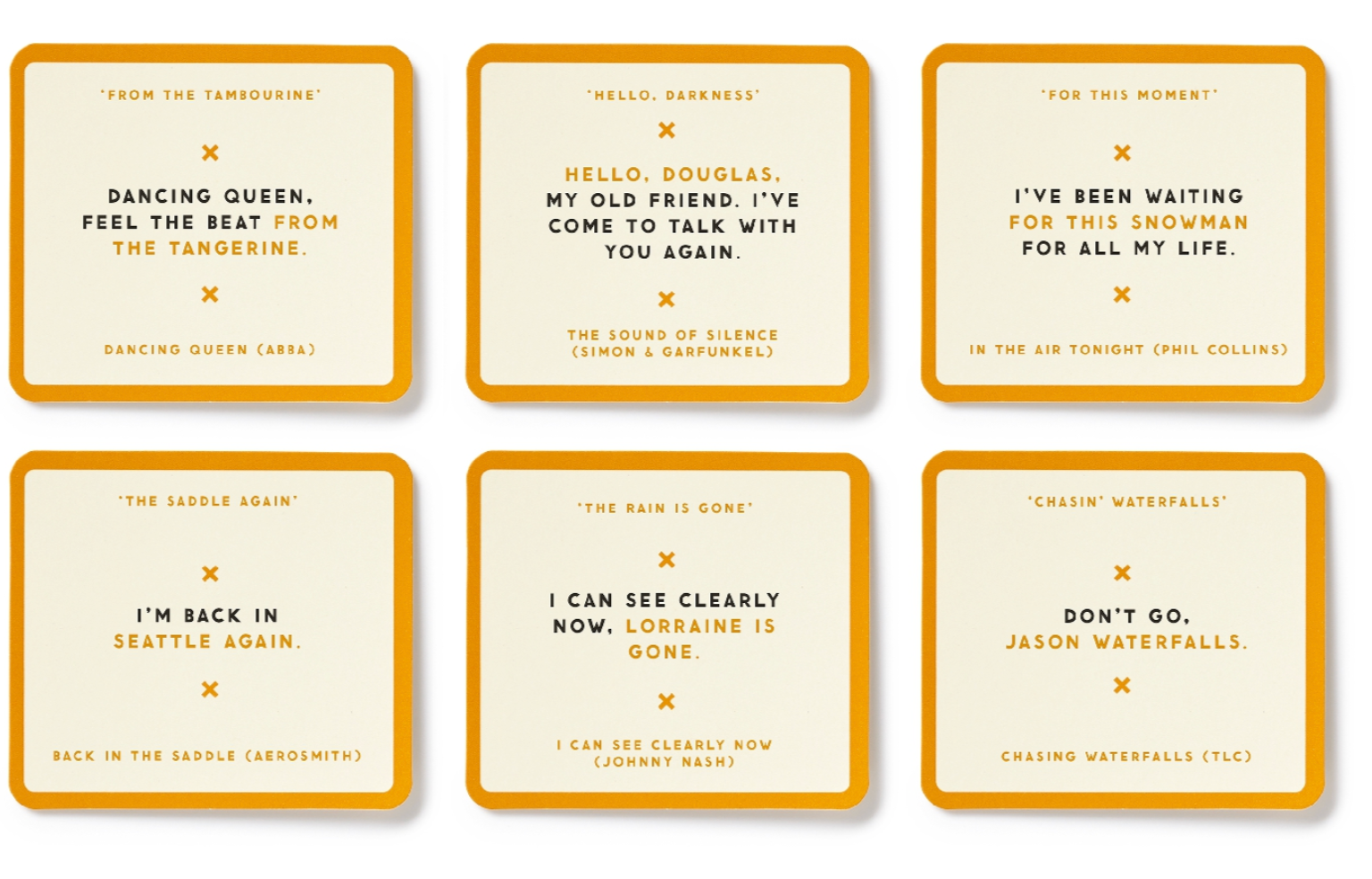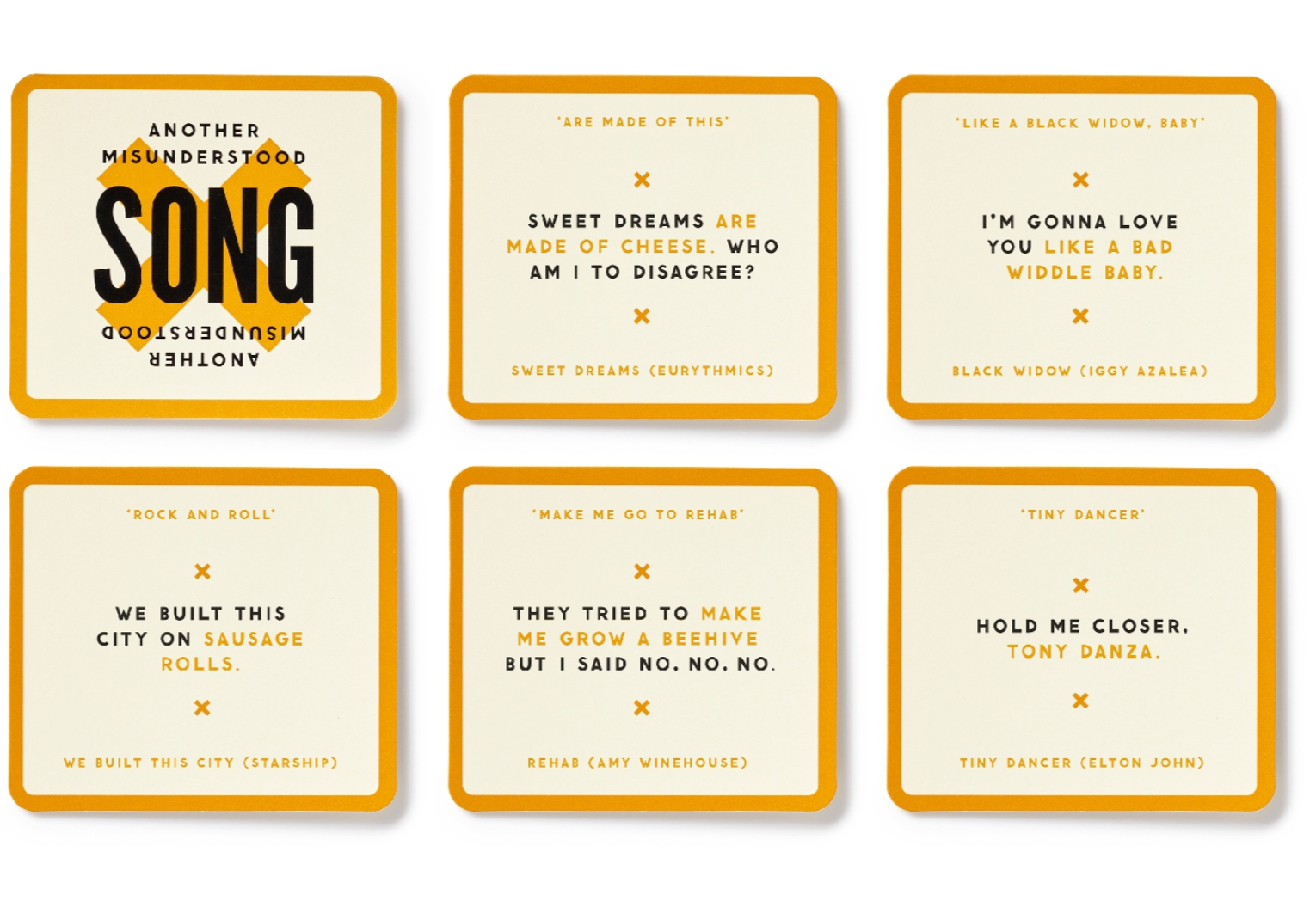 A party game all about identifying songs-from the most wildly incorrect lyrics possible. As it turns out, sweet dreams aren't actually made of cheese. Sometimes misheard song lyrics actually make more sense than the real ones-and that's the inspiration for this game. Compete with your friends to identify popular songs from the most entertainingly incorrect lyrics possible. For example: I've got two chickens to paralyze.' Psst, it's TwoTickets to Paradise' by Eddie Money.