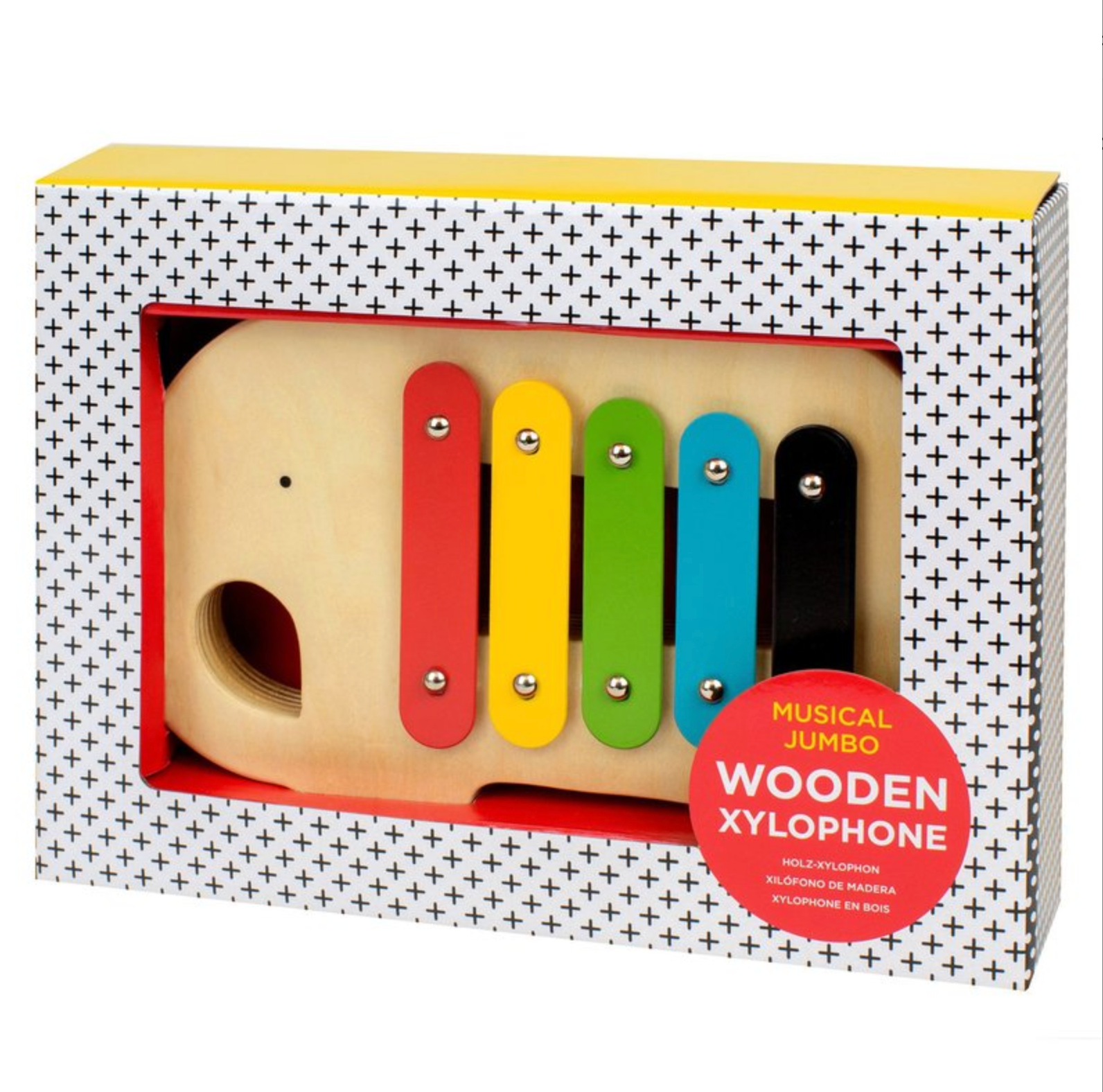 This Musical Jumbo Wooden Xylophone is a great way to introduce your little ones to harmony and rhythm through play. Five bright bars produce five sweet notes. Compact and easy to carry, the elephant trunk doubles as a handle. Made of FSC-Certified plywood. Includes an elastic hoop to safely store the wooden mallet. Ages 18 months+.