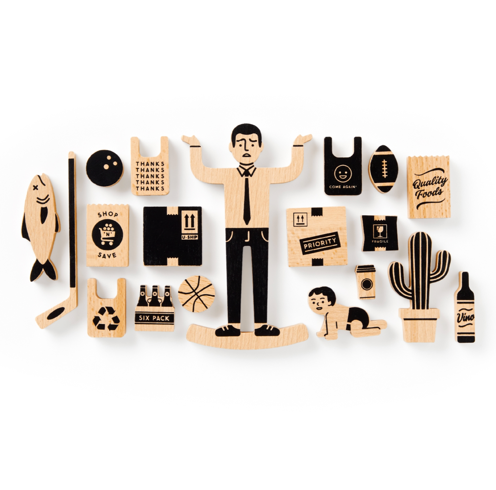 HOW TO PLAY - Players complete by taking turns adding increasingly ridiculous grocery themed items on top of a man shaped starting block-as they try not to be the one that knocks it all down. Includes 19 wood game pieces with double-sided printing and instruction sheet.