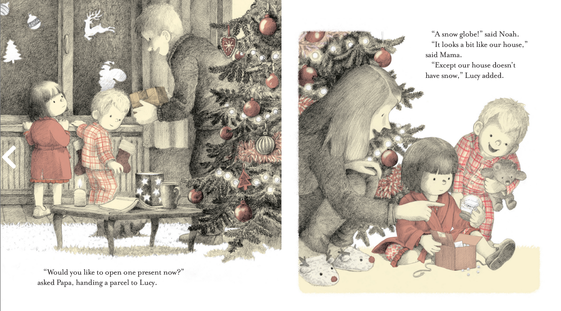 Lucy and Noah open a present on Christmas Eve. It's a beautiful snow globe, with a house inside that even looks like theirs, except they don't have any snow. Lucy lies awake looking at the snow globe, disappointed that it won't be a white Christmas. Suddenly, she feels something soft and cold land on her cheek. It can't really be snowing inside the house, can it?